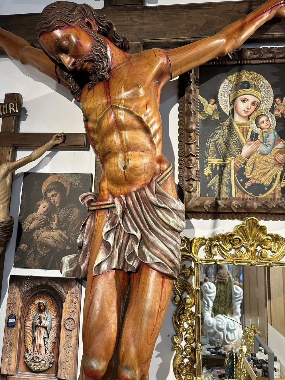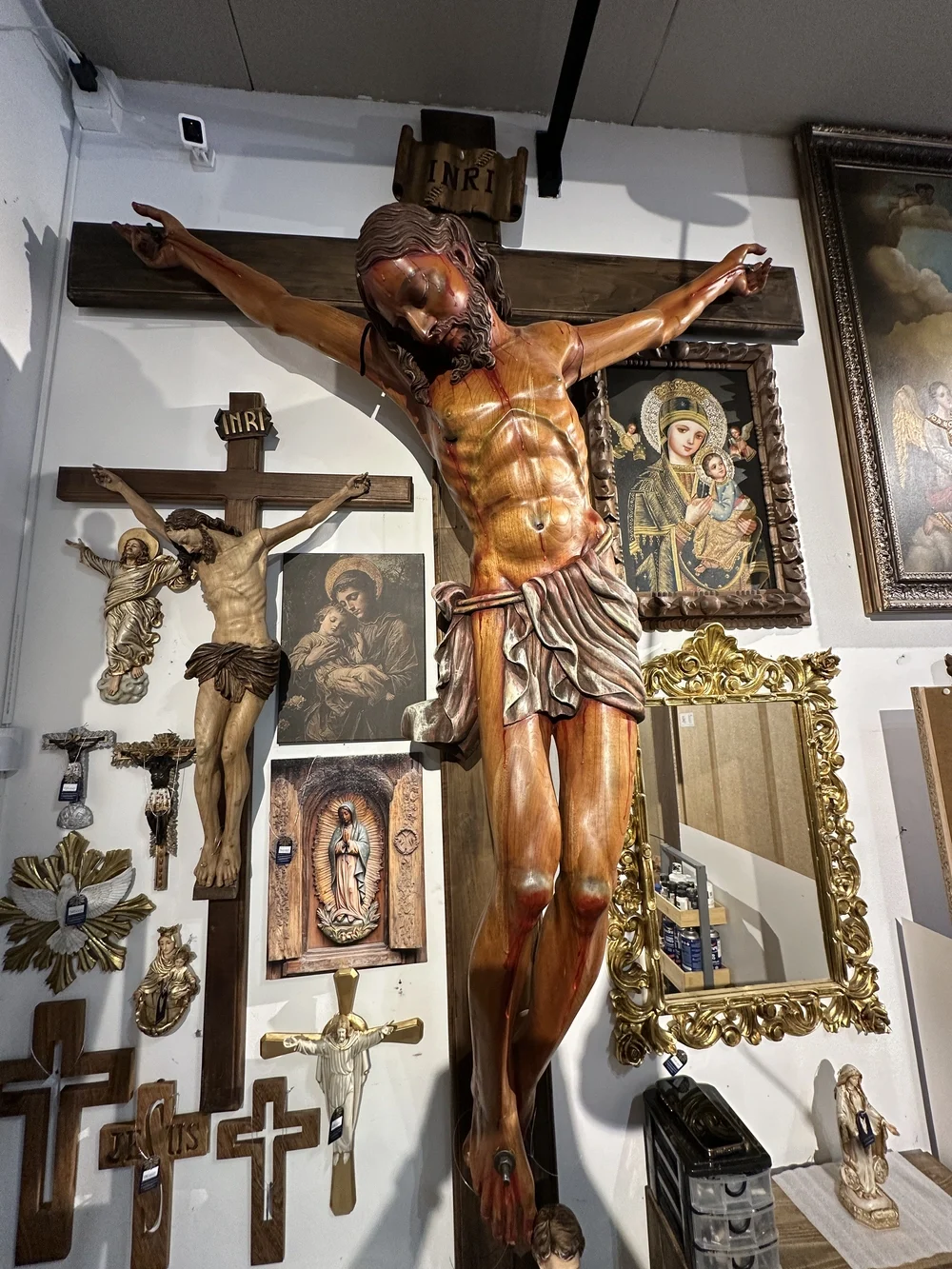 Esta imponente escultura, con 170 cm de altura de cuerpo y una Cruz de 340 cm de alto, es una auténtica representación del arte barroco colonial americano, siendo una talla en madera fiel a la tradición de la Escuela Quiteña (siglos XVII-XVIII). Esta pieza es una Obra de Arte Única de Proporciones Monumentales, fruto de un meticuloso y dedicado trabajo artístico manual. Cada curva y detalle ha sido ejecutado por artesanos calificados que preservan las técnicas ancestrales de la Escuela Quiteña. El resultado es una escultura con un alma propia, donde la impronta de la mano del artista y la belleza del veteado de la madera garantizan su exclusividad.