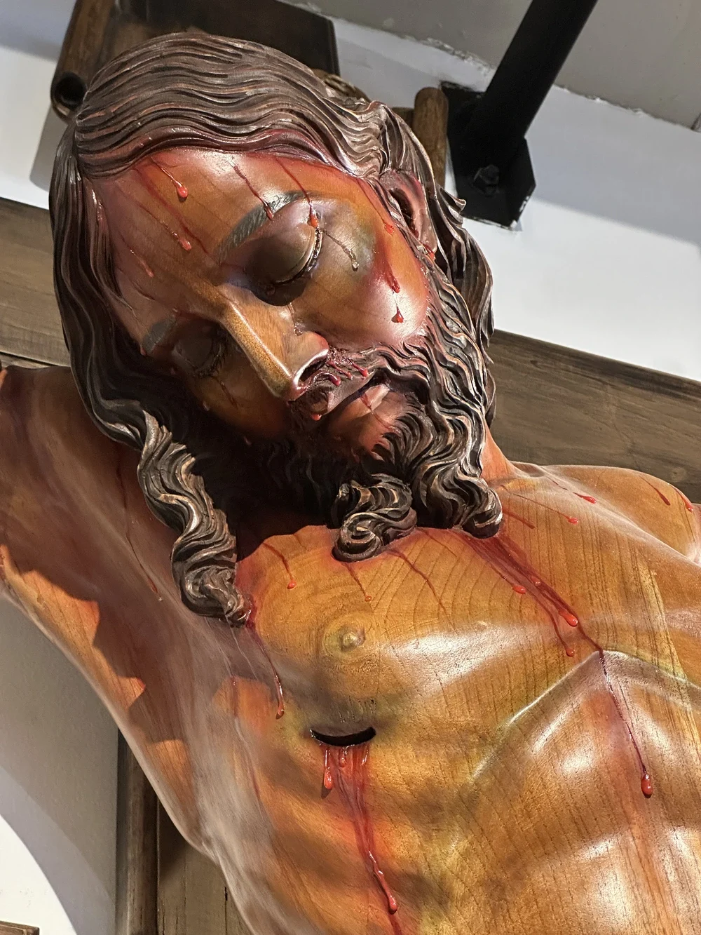 Esta escultura deslumbra por la aplicación magistral de la talla y los acabados que intensifican la agonía: