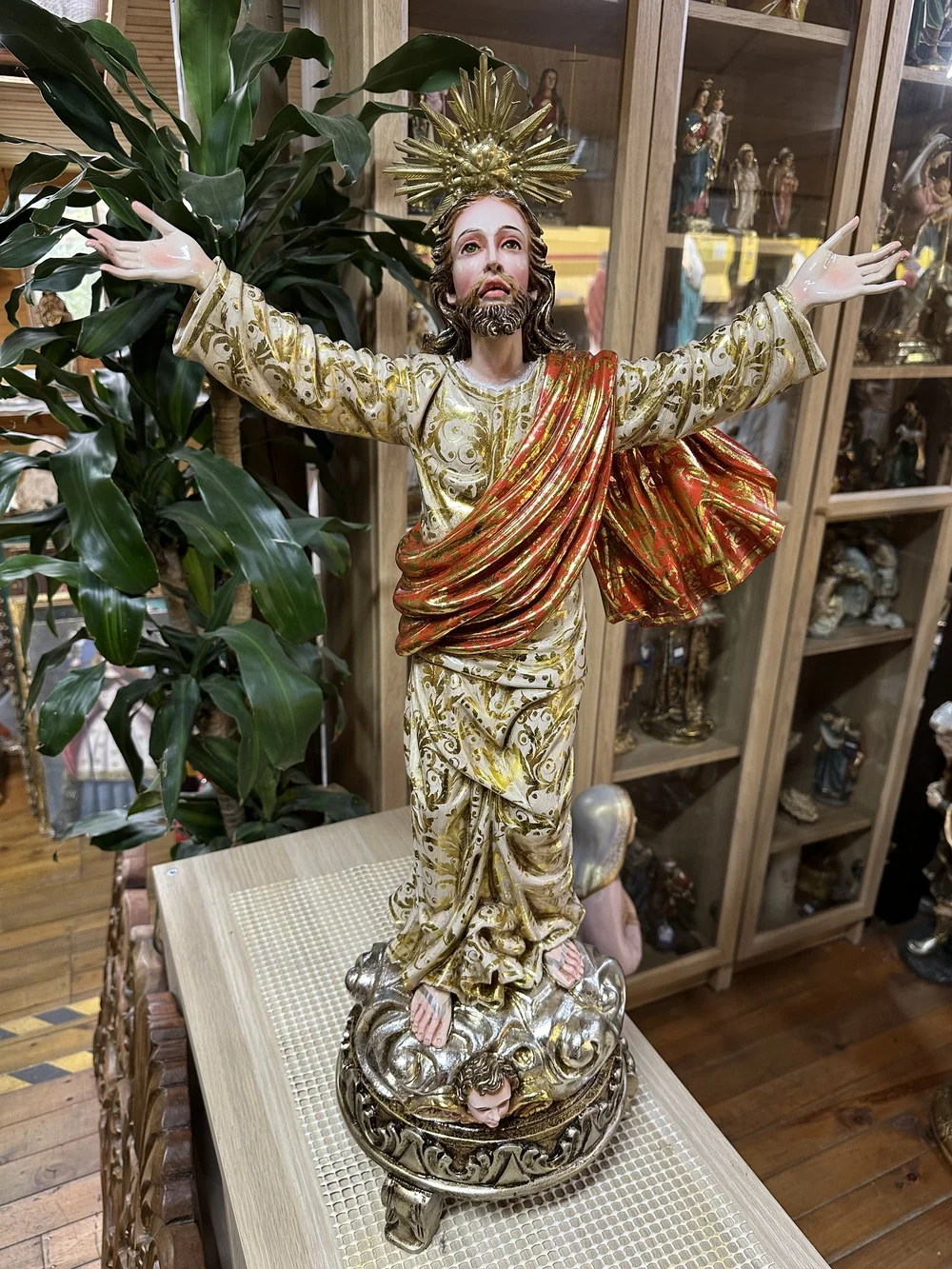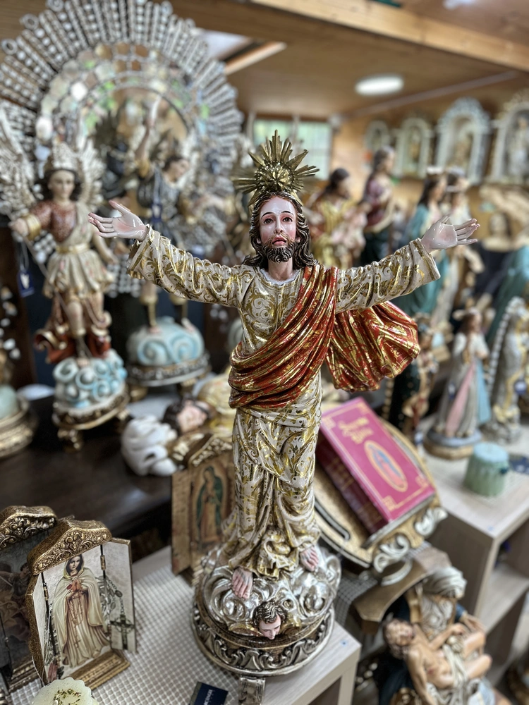 La imagen de Jesús Resucitado, de pie o ascendiendo, con su porte victorioso, es un poderoso símbolo de la Esperanza, la Victoria sobre el Pecado y la Vida Nueva. Su pose invita al devoto a meditar sobre el misterio Pascual y la fuerza de la Redención. Es una advocación que representa el consuelo, la protección divina y la promesa de la Resurrección para todos los creyentes.