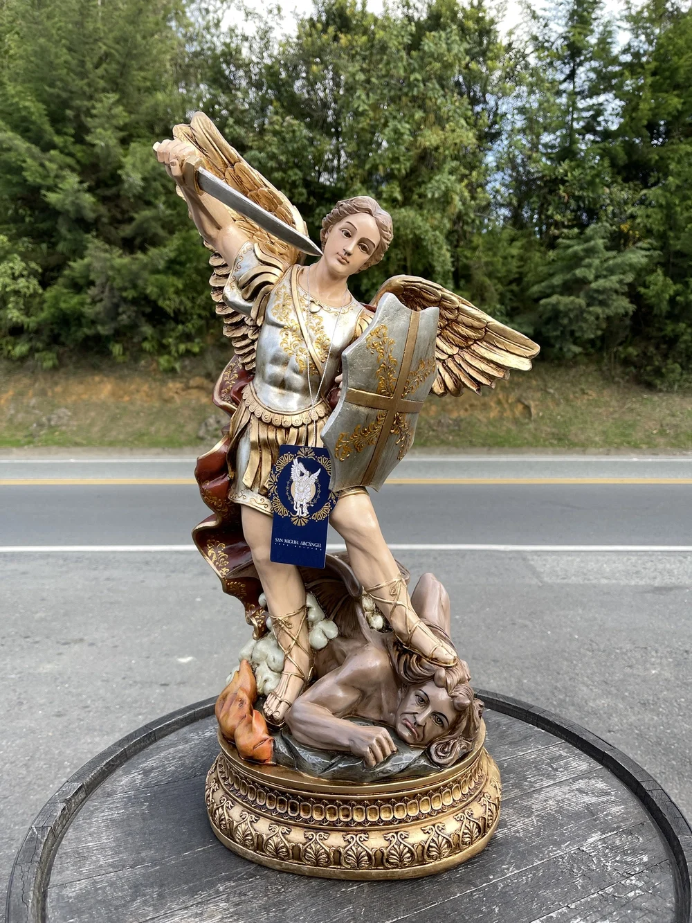 San Miguel Arcángel, el Guerrero Celestial. Esta imponente imagen de 60 cm, elaborada en fibra de vidrio de alta calidad, destaca por sus detalles y ligereza. El diseño presenta un acabado con tonos tradicionales y vibrantes, fiel a la iconografía: el manto rojo símbolo de la fuerza divina, la armadura resplandeciente que evoca la luz de Dios, y los tonos azules y blancos que representan la pureza, la lealtad y el cielo. Esta paleta de colores confiere a la pieza un carácter atemporal y profundo, haciendo de ella un tesoro de fe y devoción.